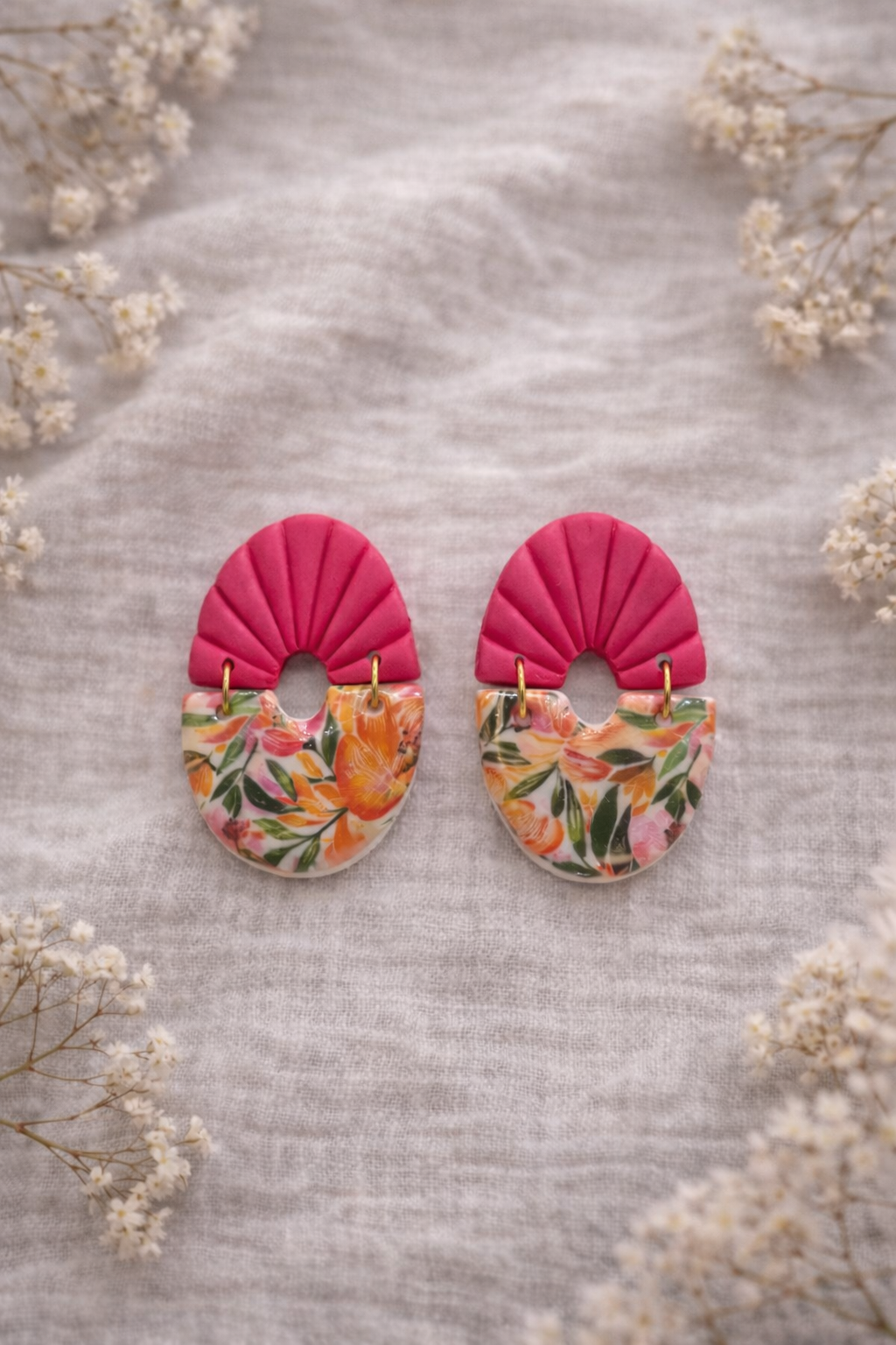 Craquez pour ces boucles d’oreilles au design original mêlant un éventail texturé rose intense et un motif floral délicat. Une combinaison parfaite pour une touche féminine, colorée et élégante.